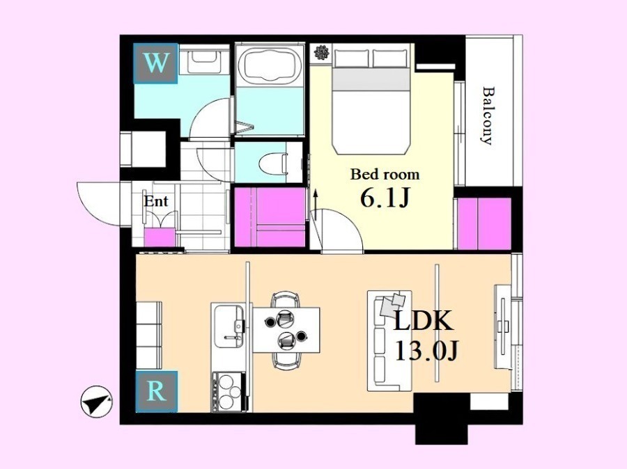 7階部分、44.46m2の1LDKで、2人暮らしにほどよい広さが魅力です。LDKは約13.0帖、洋室は約6.1帖で、収納も確保されているため、ふたりの私物をすっきり収めやすい間取りです。